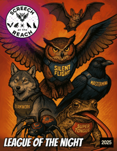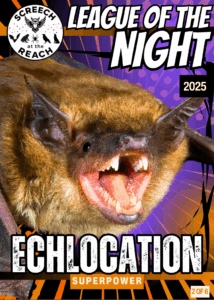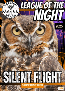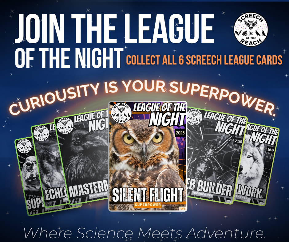 Every Screech Trading Card features an authentic wildlife photograph paired with a comic-book-style superpower — blending real science and imagination. Collect them all and join the League of the Night!